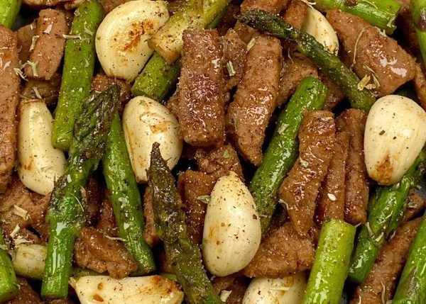 準備食材:蘆筍,牛肉,蒜瓣,黑胡椒碎,歐芹碎。