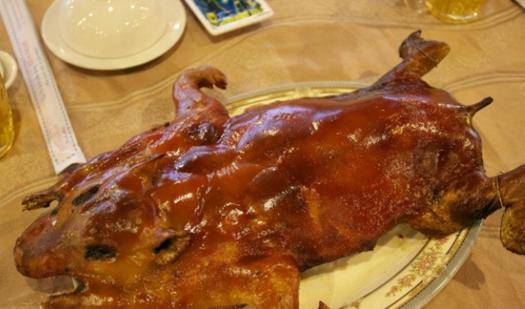 要說這道烤乳豬,可真是讓各位大爺飽瞭眼福,看著小巧逼真的小乳豬,各位大爺都紛紛的拿起手機開始拍照。這道烤乳豬算是當天的最貴的主菜,通常都是當地人祭祖或是慶典時餐桌上才會出現,老哥幾個每人吃瞭兩口就吃不動瞭,畢竟年齡在這裡,飯量也是有限的。但是味道確實不錯,口感外皮酥脆,肉質還軟爛,牙口不好都能吃。