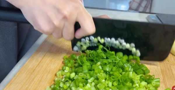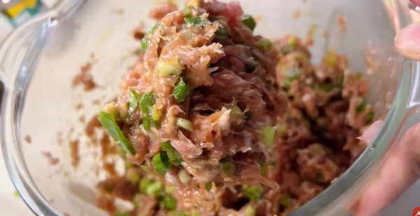 4、將切好的小蔥和薑末加入到肉餡中,順時針攪拌均勻,最後再滴幾滴香油。