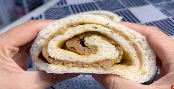 導語:肉龍是一道傳統京味小吃,發好的面搟成餅,再均勻抹上一層肉餡,卷起來再上鍋蒸熟,吃的時候切開,面皮柔軟,肉餡咸香,非常好吃。