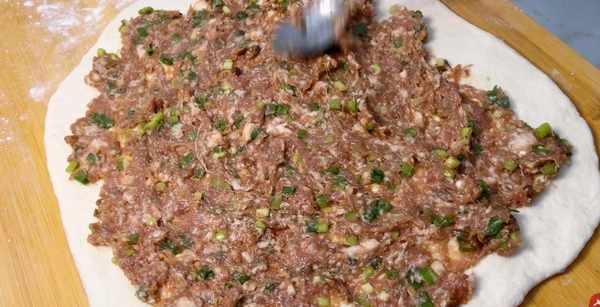 5、面團發酵至2倍大時取出,在案板揉光滑,搟開成大面片,鋪上肉餡,邊緣略留空。