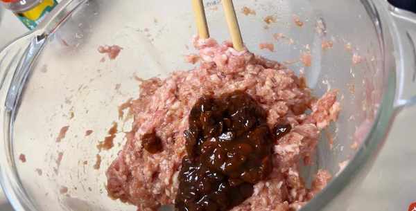 2、將豬肉絞成餡,加入薑末、鹽、料酒、水、生抽、黃豆醬和蠔油,朝一個方向攪拌至順滑有黏性。