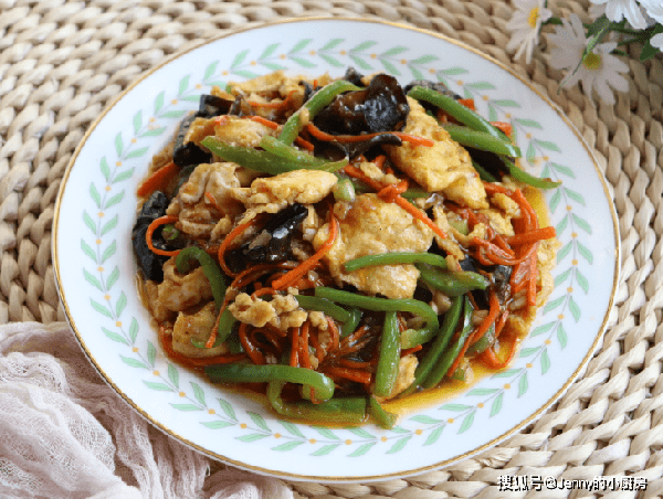 接著倒入胡蘿卜、青椒、木耳翻炒,炒到胡蘿卜變軟,再倒入雞蛋翻炒均勻。