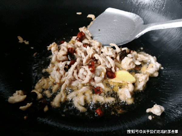 3、起鍋,倒入適量油燒熱,倒入醃好的肉絲,小火滑炒至變色後盛出。鍋裡留底油,放入薑絲、幹辣椒爆香,倒入焯過水的蒜薹,大火翻炒2分鐘。蒜薹斷生後加入食鹽、生抽、蠔油調味,再放入炒好的肉絲,大火翻炒均勻即可出鍋。