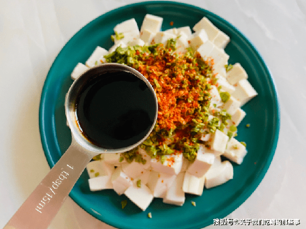 3、把豆腐放入大碗中,上面放上切碎的香椿,加一勺辣椒面,鍋裡倒入熱油燒至冒煙,倒在辣椒面上熗出香味,再加入適量食鹽、生抽、花椒油,翻拌均勻即可裝盤。