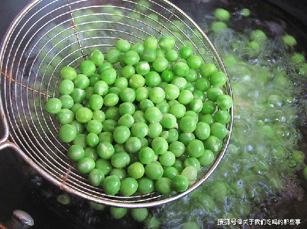 2、燒一鍋開水,加入一勺鹽,放入豌豆大火煮3分鐘,熟透後撈出過涼水,瀝幹水分。鍋裡重新加油,加入薑絲、花椒炸出香味,撈出扔掉。