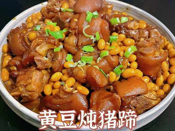 將黃豆提前浸泡半天,將豬蹄洗凈焯水2~3分後沖洗幹凈。鍋內下油,待油熱時下生薑片、蔥段,八角,豬蹄爆炒,然後加醬油,料酒翻炒下。加水沒過豬蹄,大火燒開,然後轉小火,燒20分鐘。加入黃豆大火燒開,加些糖和鹽。小火慢煨,直到豬蹄爛為止,放入味精,蔥花,出鍋即可。