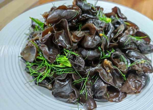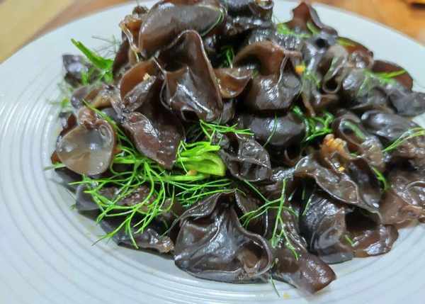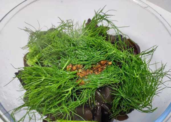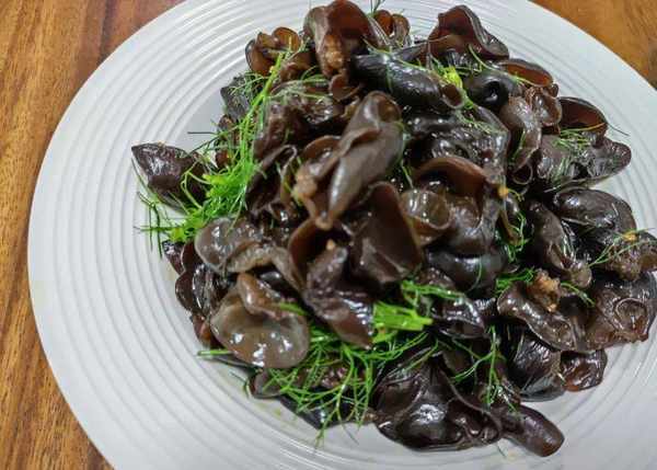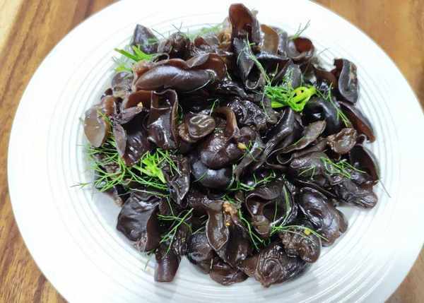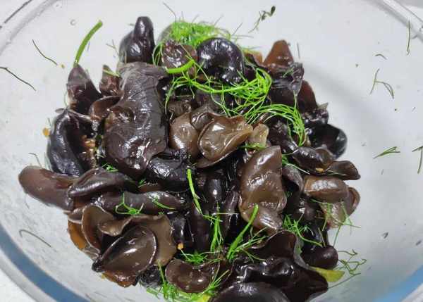 3.煮木耳的時間也不能過長,煮得太久會將木耳煮得太爛,口感差。木耳煮好後撈出放到盆裡面,然後把茴香葉也放在上面;