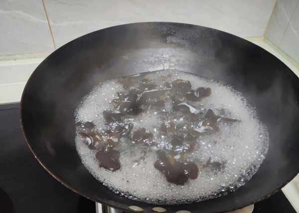 一小把的木耳通過浸泡它會變成一大盆,所以浸泡木耳的時候也要註意用量,不要泡太多,因為這種木耳最好現泡現煮,隔夜的話吃起來對健康不利。木耳泡發之後放在清水中,用水稍微沖洗一下,就可以看到底部有一層臟臟的黑水。要將木耳洗白白,直到水變清澈為止,洗凈之後放到一旁;