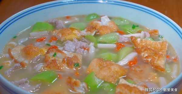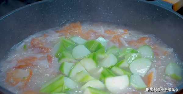 6、把醃制好的肉片放進鍋中,先不要動,定型以後我們用鏟子輕輕的推動一下,再把準備好的絲瓜塊放進鍋中,開始調味,加入食鹽,雞精,五香粉,推動均勻,再煮兩分鐘,讓絲瓜充分的熟透。出鍋前撒入適量的幹枸杞和蔥花,點綴一下就可以出鍋瞭。