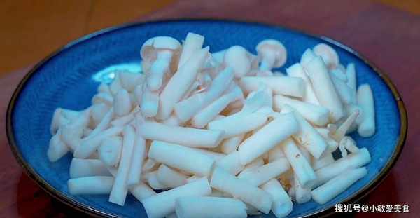 3、再準備一把海鮮菇,切成長段,切好以後放進碗中備用。一塊生薑,先切成薑末,一把小蔥,蔥白和蔥葉分開切,切成蔥花備用。