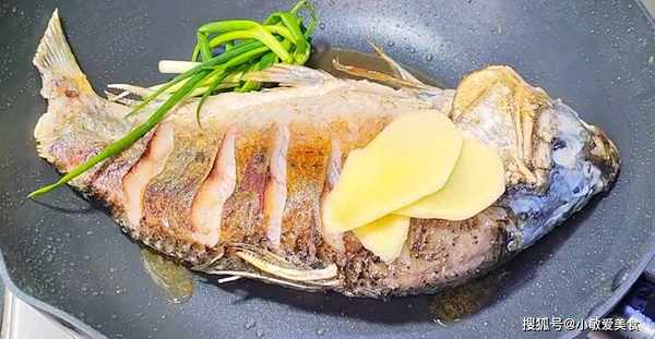 5、不用關火,再把鯽魚直接放入油鍋裡,煎至制定型之後晃動一下鍋子,讓它受熱均勻。然後翻面煎另一面,煎至金黃,放入蔥段還有薑片,把煎好的雞蛋也加進來,倒入開水,蓋上蓋子大火煮六分鐘。