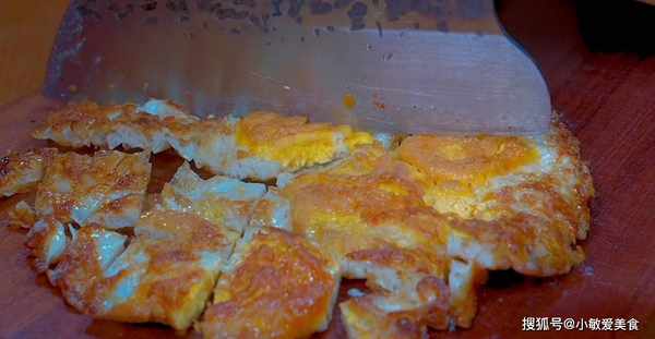 4、碗中打入4個雞蛋,鍋中倒入適量的底油,油熱以後把雞蛋倒進鍋中,先不要動,等到雞蛋定型以後,再輕輕的晃動鍋子,煎至兩面金黃,放到案板上,切成小塊。