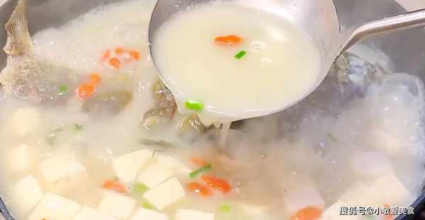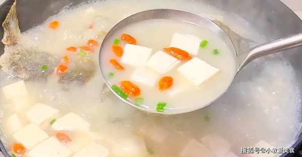 6、時間到打開蓋子,把裡面的薑片還有蔥夾出來,放入豆腐,再加入一勺食鹽,蓋上蓋子繼續煮三分鐘,煮好之後放入一勺胡椒粉,去除腥味。放一把枸杞,來點蔥花點綴一下,一道營養又美味的鯽魚豆腐湯就制作完成。