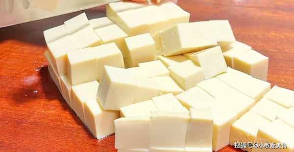 2、再準備一塊豆腐,切成小丁。切完以後放入大碗中,倒入開水,浸泡兩分鐘,這樣可以去除豆腐的腥味。