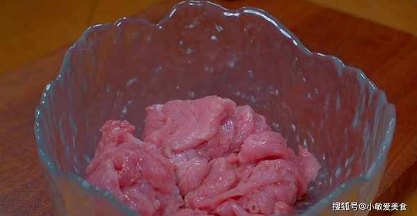 2、再準備豬裡脊肉,切成薄片,放進碗中,加入1食鹽,白胡椒粉,一勺料酒,一個蛋清,一勺淀粉,抓均勻,醃制20分鐘。