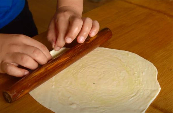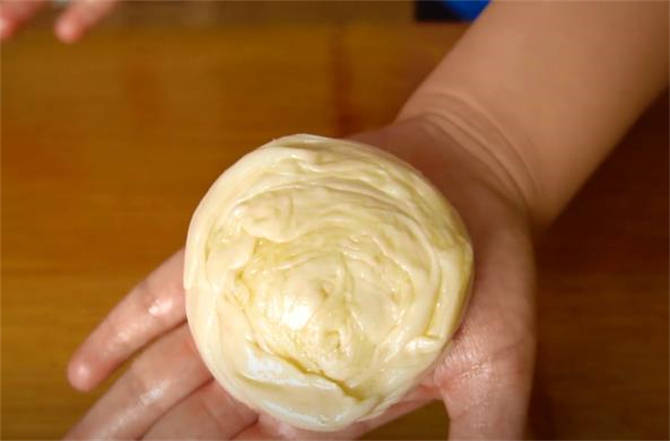 3.直接把小面劑按扁,給它按開瞭,然後用搟面杖搟成一張比較薄的餅皮,搟的時候一定要註意力度,搟慢點,搟好瞭在表面抹油酥。