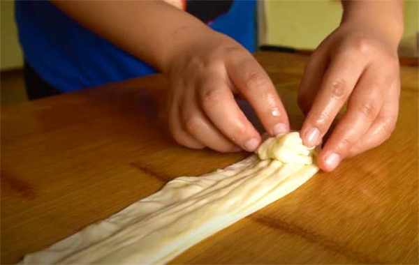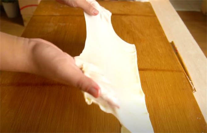 4.搟好之後像疊扇子那樣把餅皮疊起來。
