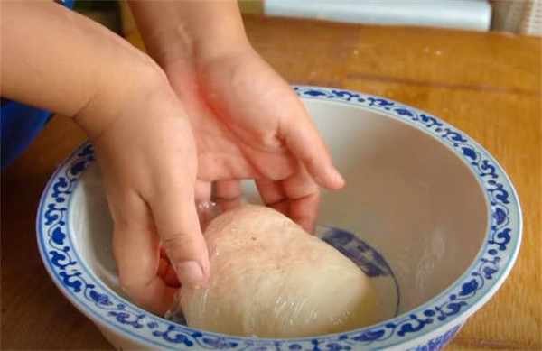 5.按一按把裡面的空氣給它排出來,然後從一端往裡卷,卷的時候邊扯邊拉伸。