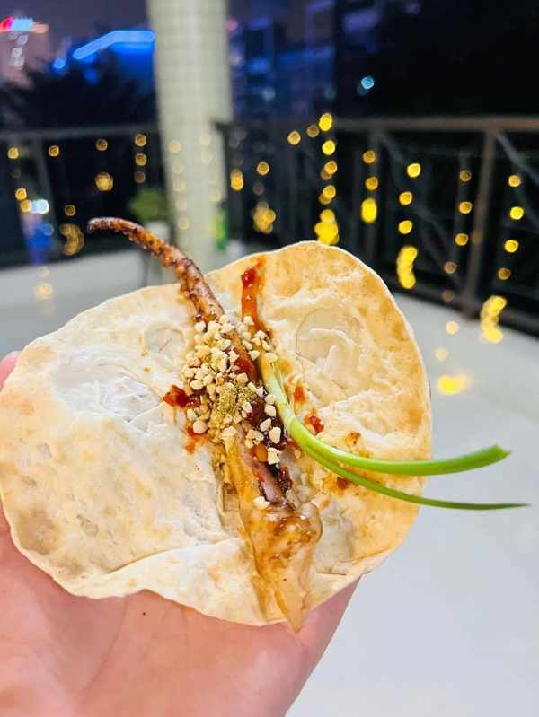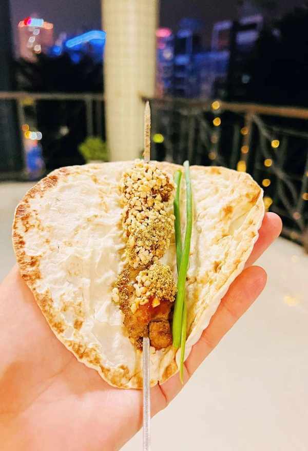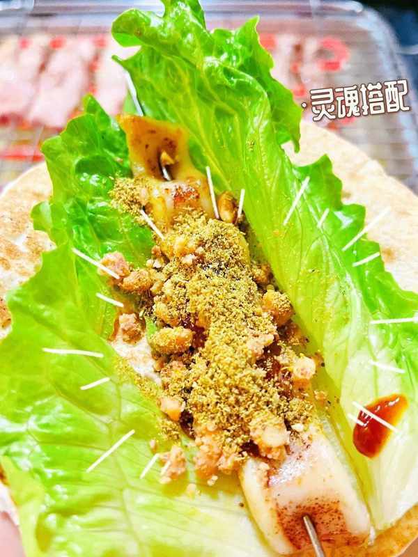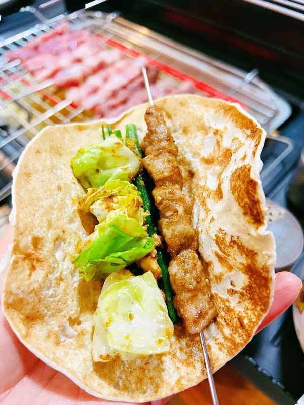 左手拿小餅,右手拿肉串蘸孜然花生芝麻鹽、蘸燒烤醬、放小蔥,開擼、卷起來,好吃?