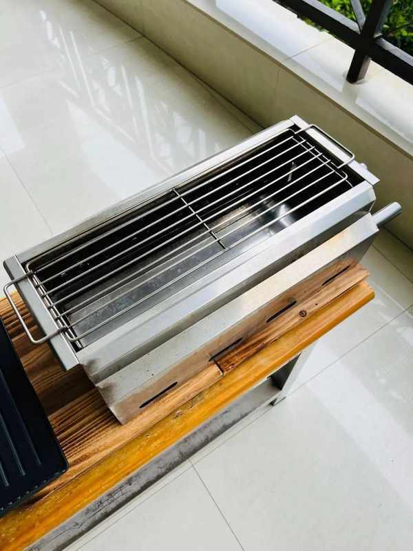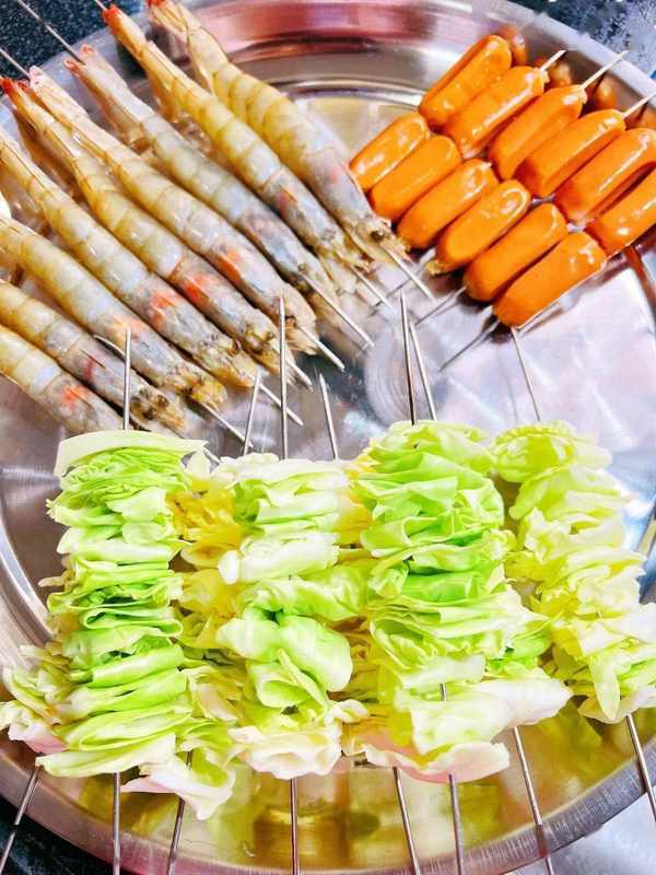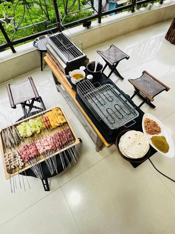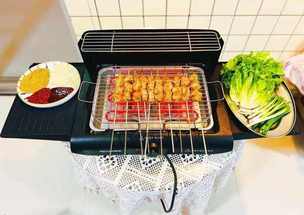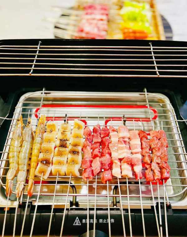 馬紮、撒料、蘸料都準備好瞭。為瞭快點吃上,我準備瞭兩個烤爐,電烤爐先烤8分熟,再轉去淄博烤爐上邊烤邊吃。