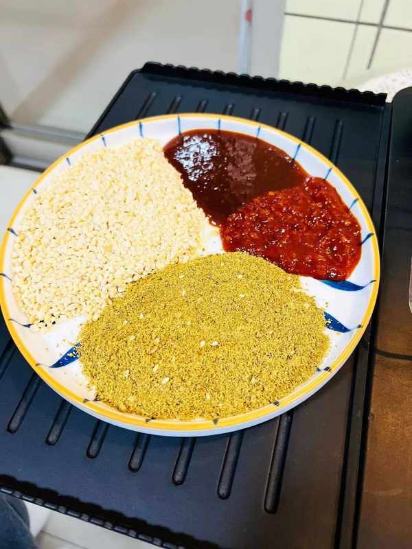 [4] 配料:花生碎、孜然芝麻蘸料、原味燒烤醬 (巧媳婦)、蒜蓉辣醬 (利民)。