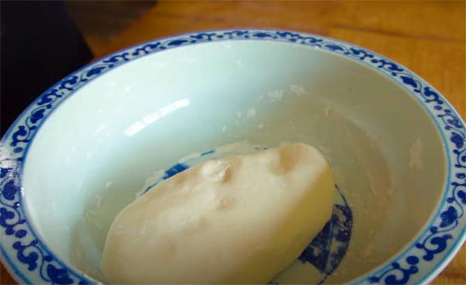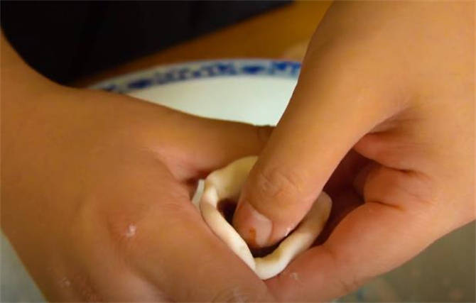 2.面團餳好之後咱們就不用揉瞭,直接揪取一部分的大小,然後在掌心團圓,這一次一定要團勻瞭,團勻之後直接用手按成一張中間厚四周薄的小餅皮,按好之後咱們在裡面包上一顆豆沙餡,利用這個虎口處向裡收,用虎口處收得比較緊,把周圍都捏實瞭。