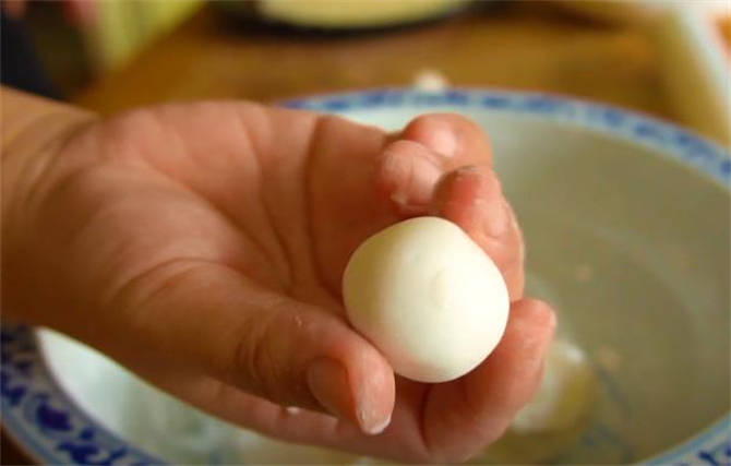 3.捏實之後再次在掌心團圓,團成這麼大的一個小圓球就行瞭,這個劑子不需要做的太大,因為這個麻團在炸的時候會膨脹。