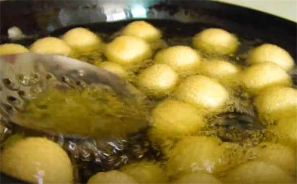 5.現在都做好瞭,咱們可以開始炸瞭,炸麻團的時候這個油溫比較特殊,直接是涼油下鍋,而且這個油一定要多倒點,起小氣泡的時候推動麻團,等麻團開始浮起來的時候,咱們用這個勺子邊轉動邊按壓,按壓的時候一定要註意勻著力,你看看現在都浮起來瞭吧,而且麻團都已經變大瞭,咱們繼續勻著力按壓下去。