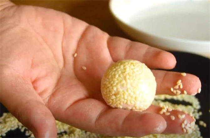4.都團好之後準備一些白芝麻和清水,先在清水裡面滾一圈,表面再裹一層芝麻,裹好之後接著用掌心團圓,這樣芝麻會粘的更牢固。