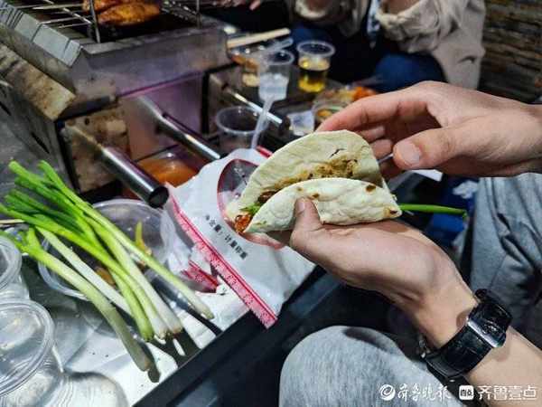 “老板,再來份蔥和蘸料,來五份小餅。”前來吃燒烤的劉先生喊道。聊到為啥來這裡吃燒烤,他表示:“我本身就愛吃燒烤,加上最近淄博燒烤實在是太火瞭,就想著找一傢來嘗嘗。這種小餅卷燒烤的吃法確實好吃,我也是在社交平臺上跟別人學的,吃起來很有儀式感。”