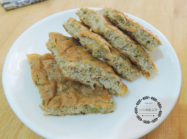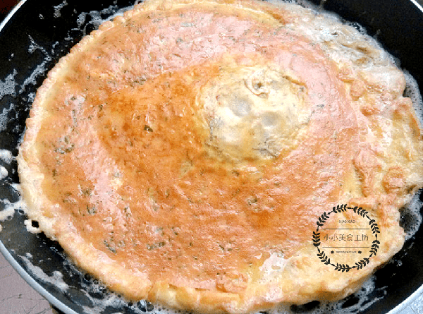 3、鍋中倒入食用油,油熱後倒入香椿蛋液,一面定型後翻面繼續煎制,兩面都定型且煎至金黃後即成盛盤。