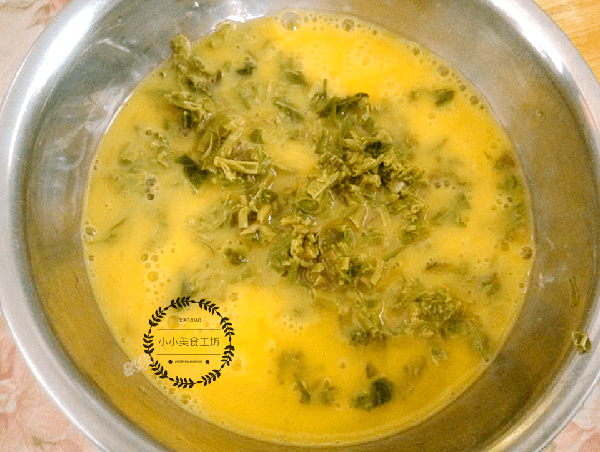 2、碗中打入4個雞蛋,加入少許食鹽攪拌均勻,再將香椿碎放入雞蛋中拌勻。