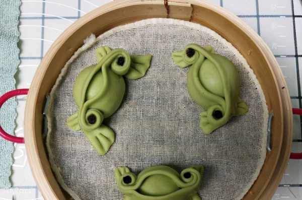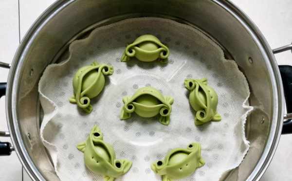 19、發酵好以後上鍋蒸15分鐘就可以瞭,可愛的小青蛙就做好瞭。