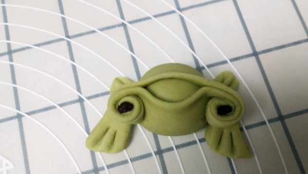 17、把黑提子幹放到青蛙的眼睛中間做裝飾。