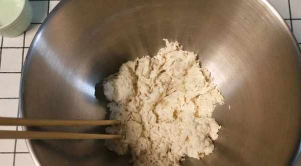 3、把面粉和砂糖攪拌均勻,然後往面粉盆裡分次倒入溫水,一邊倒水一邊用筷子輕輕攪拌面粉,直到攪拌至沒有幹粉,面粉變成棉絮狀。