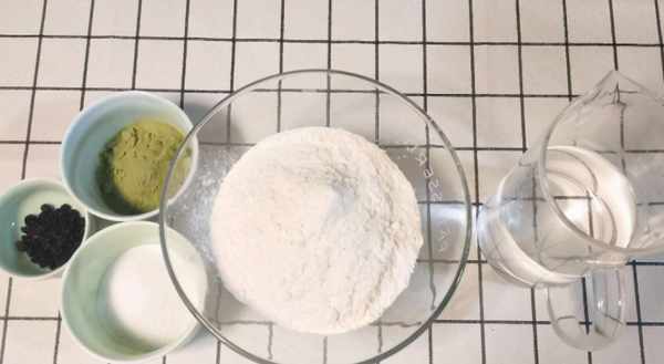 [所需菜品]:自發面粉250克,砂糖20克,菠菜粉6克,溫水150毫升,黑加侖提子幹一小把。