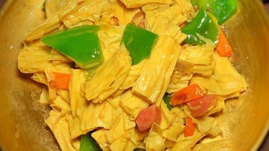 腐竹富含蛋白質,有利於腦力發展,青椒和胡蘿卜都富含維生素,這道菜是著名的粵菜,色香俱全,很適合夏天