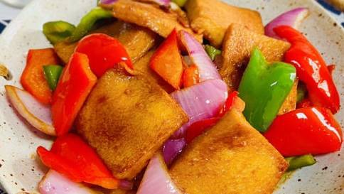 1.切好紅椒、青椒、洋蔥和千葉豆腐,切蒜末