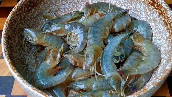 2.處理一下大蝦用剪刀剪去大蝦的半個頭,再挖出裡面的蝦腦,蝦線一起拔出來,放入大碗裡倒入適量的清水,把大蝦清洗一下,瀝幹水分放回碗裡。