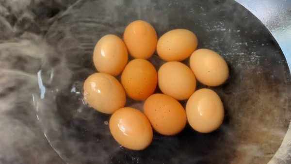 5.起鍋倒入冷水,再放入一勺食鹽,把雞蛋放入鍋中,小火慢慢的燒開,開鍋後煮至一分鐘多晃動幾下鍋底,再次煮至三分鐘即可撈出,把雞蛋倒入涼水中,用搟面杖把雞蛋敲破。