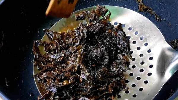 5.鍋燒熱倒入稍微多一點油,油溫五成熱放入茶葉煸炒,中火不停的翻炒,炒出茶葉的香味,把茶葉的水分炒幹,撈起瀝幹油放碗裡備用。