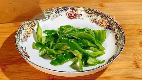 3.青椒把辣椒蒂切斷不要,再去籽,切成辣椒圈,切好後放進碗中備用。