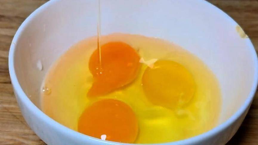 6.小碗打入三個雞蛋,用筷子把雞蛋攪散,鍋預熱後,加入少許的食用油,油熱倒入雞蛋液,開大火快速的把雞蛋炒熟,加入少許食用鹽,一點雞精,一點胡椒粉,少許白糖,繼續去翻炒均勻。
