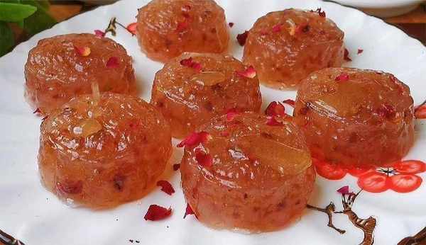 7.時間到玫瑰花糕就蒸熟啦,出鍋裝盤,再撒一些玫瑰花瓣點綴一下,再淋頭一些蜂蜜,晶瑩剔透,香甜軟糯。