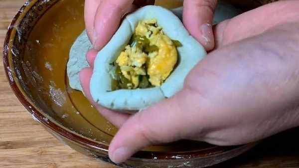 7.面也醒好瞭揪起一團面塊,團幾下團成圓形,再把面團中間戳出一個小窩窩,放入準備好的餡料,用虎口慢慢的往裡面收攏,青團就包好瞭。