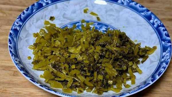 5.準備一些咸菜,把咸菜切成碎末,切好裝到盤子裡,大蔥切成蔥段,大蒜拍扁切成蒜末,切好與咸菜先放到一起。