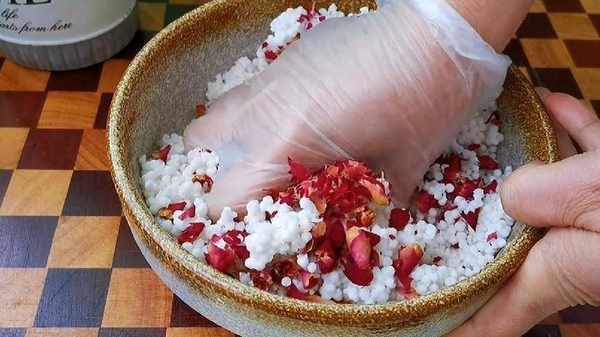 3.西米泡成這種一捏就碎的狀態即可,倒入一勺蜂蜜,再倒入玫瑰花瓣,先用手抓拌均勻,在下手揉成面團。