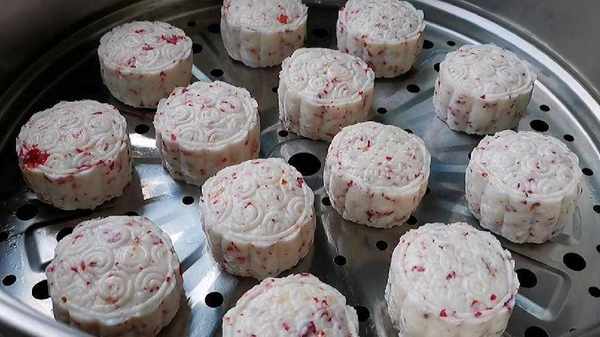 6.蒸鍋裡刷上一層使用油,把做好的玫瑰花糕擺在蒸籠上面,蓋上蓋子大火蒸十分鐘。