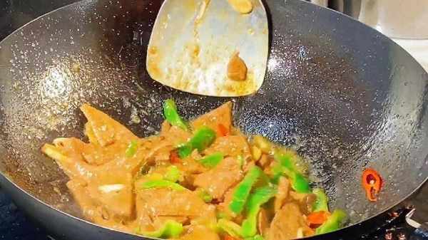 6.炒出鍋氣,不用翻炒太長時間,30秒鐘把蔥段倒進,再次翻炒均勻,關火出鍋裝入盤中,這樣做的豬肝顏色太好看,鮮美入味。